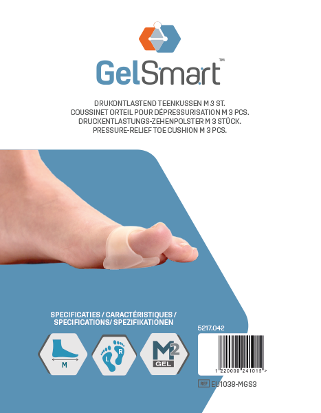 - Druktontlastend en multifunctioneel gelkussen dat zowel onder, tussen als op de teen geplaatst kan worden: